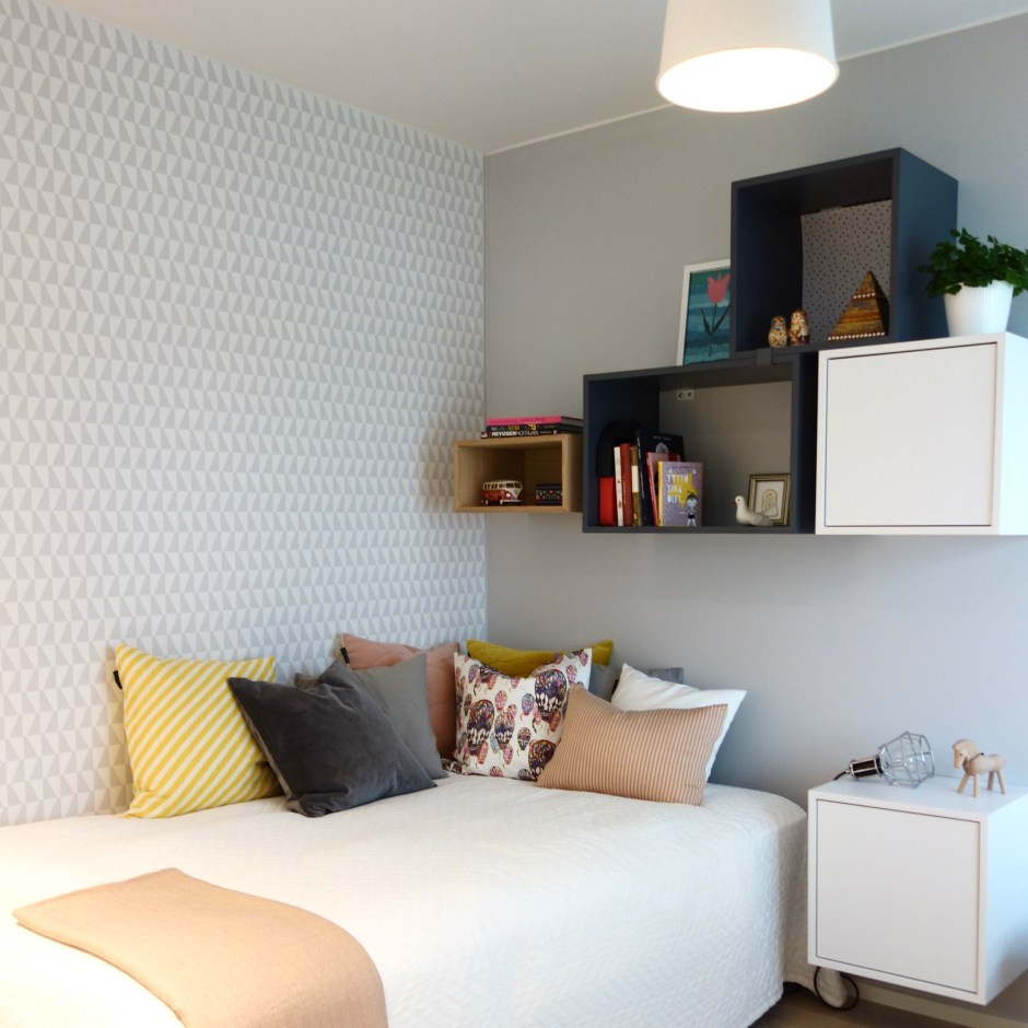 Kuva on Mikkelin Asuntomessuilta, kohteesta Casa Wellikulho. Tässä talossa oli käytetty tosi kauniisti värejä ja erityisesti lapsille sisustetut huoneet sykähdyttivät. Trapez-tapetin kuosi löytää hienosti parin vaaleanharmaaksi maalatusta seinästä ja pehmeistä puun ja pastellien sävyistä. Tykkään!