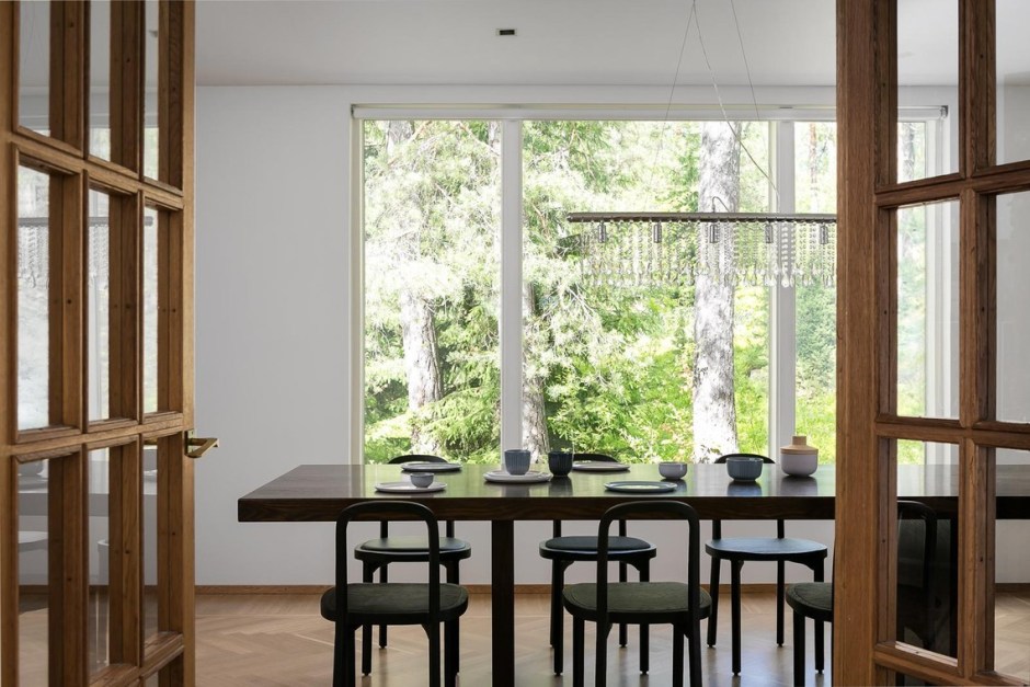Olen ennenkin kertonut, että 50-luvun arkkitehtuuri viehättää tosi paljon ja tämä talo olisi kyllä niin unelmakoti! Tuo ruokailutila aiheuttaa huokauksia – mikä ikkuna, mitkä pariovet, mikä tunnelma! Olohuone on myös todella upea, vai mitä sanotte? Taidetta ja värejä on käytetty onnistuneen hillitysti. Ja kyllä, mulla on heikko kohta parketteihin, erityisesti tammeen. Kalanruotoladonta näyttää järkettömän ihanalta.